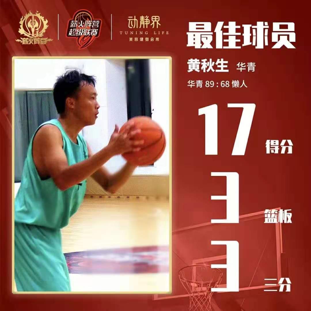 华青队黄秋声17分3篮板,卢鸿新14分,陈昇14分。懒人队蔡日诚21分2篮板5抢断,卓泽南16分7篮板2助攻。